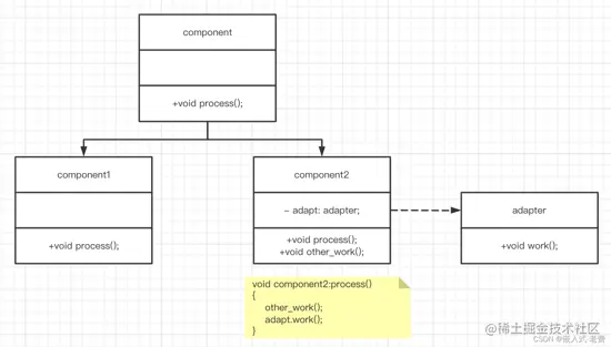 适配器模式,大家可以和代理模式比较着来学习。在代理模式中,代理提供的接口和原来是一样的。而在适配器模式中,适配器的接口和原来是不一样的。同样以大家都熟悉的视频接口来说,一种老式的显示器接口是vga,这是很老的接口。但是现在笔记本电脑普遍都是usb接口、hdmi接口,所以这个时候如果需要把笔记本适配到老式的显示器上,只能借助于一个转换接口才能完美兼容老式的显示器。用一个类图可以这么来表示,