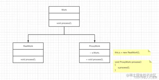 代理模式比较简单,现实中也有这样的案例。比如开一个建筑公司来承揽工程,但是在这个领域开设公司是需要相关资质的。这个时候就有两种办法,一种办法就是公司自己去努力申请相关资质;另外一种就是公司将自己挂靠在某些有资质的公司上面,遇到不需要资质的项目就自己去独立完成,遇到有资质要求的工程,那只好转包给有资质条件的公司了。如果画一下图,可以这么来表示,