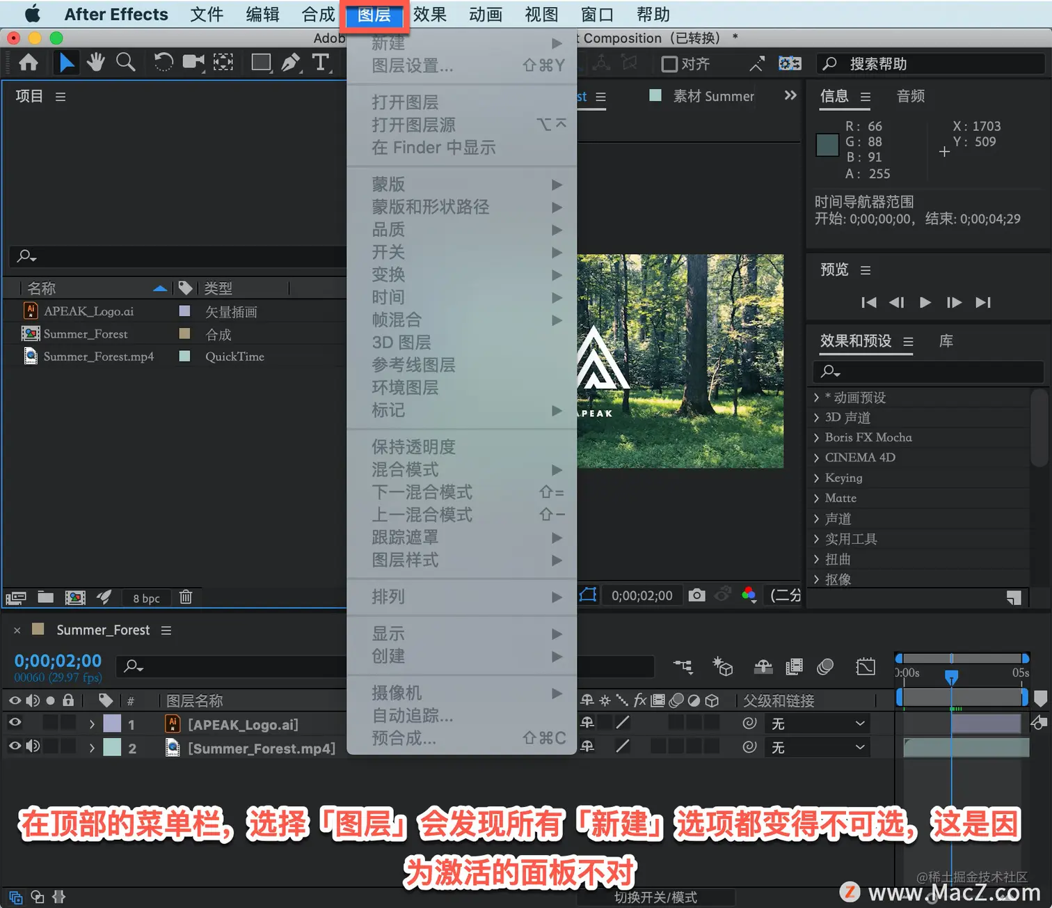 首先创建一个纯色图层,在顶部的菜单栏,选择「图层」会发现所有「新建」选项都变得不可选,这是因为激活的面板不对。