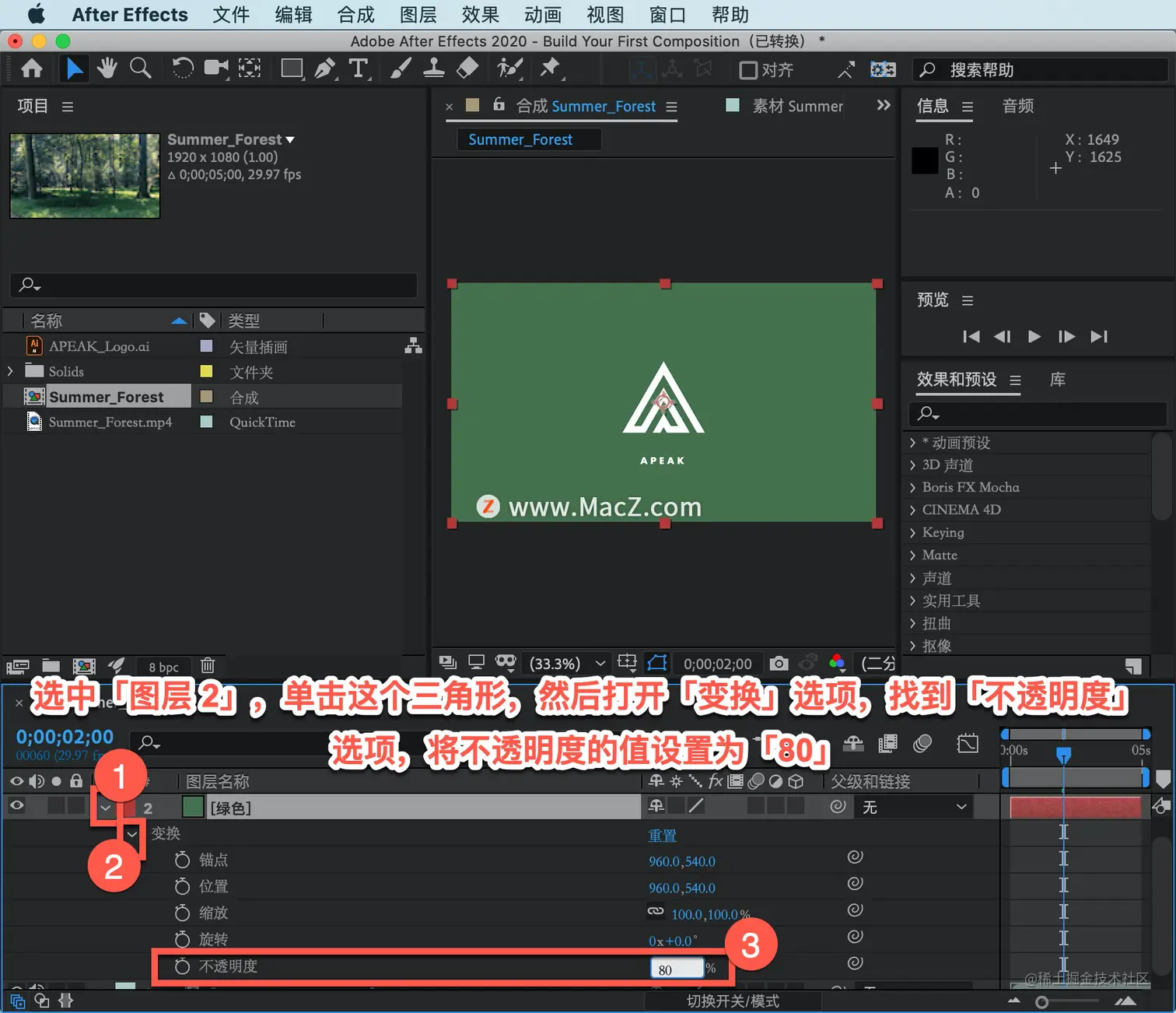 选中「图层 2」,单击这个三角形,然后打开「变换」选项,找到「不透明度」选项,将不透明度的值设置为「80」,在键盘上按下 Return 键。