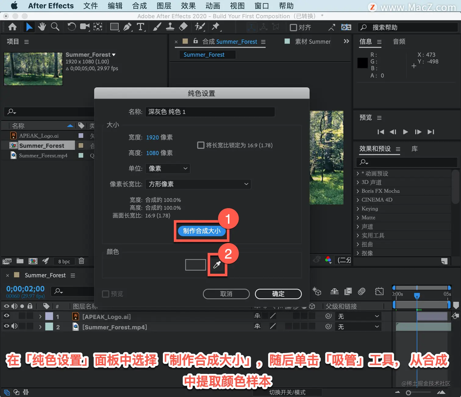 在「纯色设置」面板中选择「制作合成大小」,随后单击「吸管」工具, 从合成中提取颜色样本。