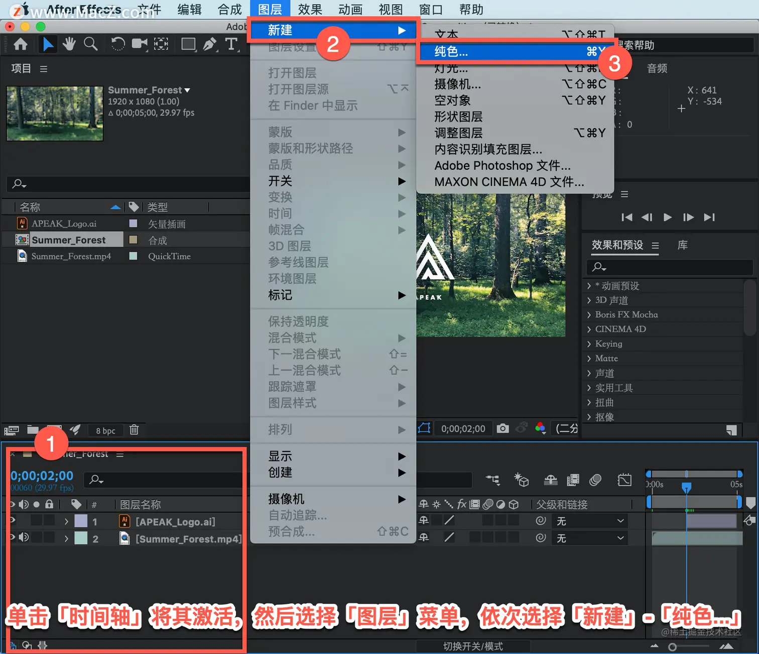 单击「项目」面板使其处于活跃状态,单击「时间轴」将其激活,然后选择「图层」菜单,依次选择「新建」-「纯色...」。