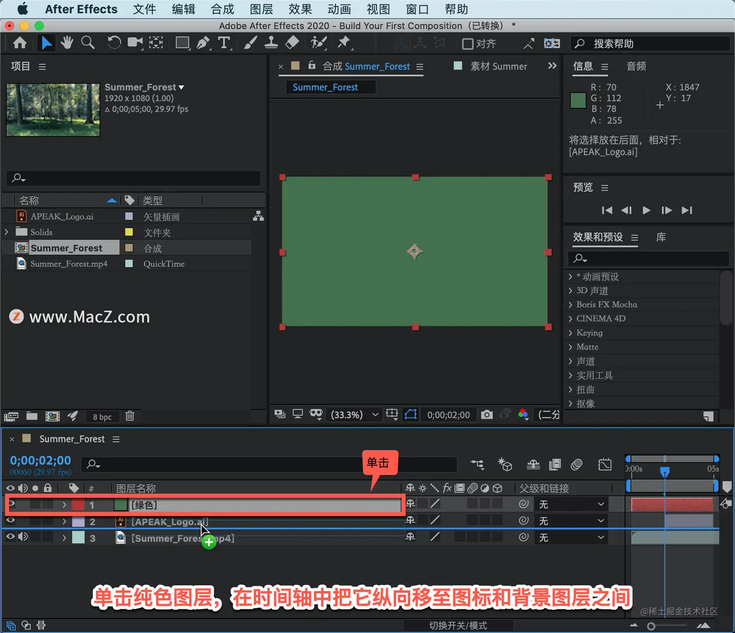 单击纯色图层,在时间轴中把它纵向移至图标和背景图层之间。