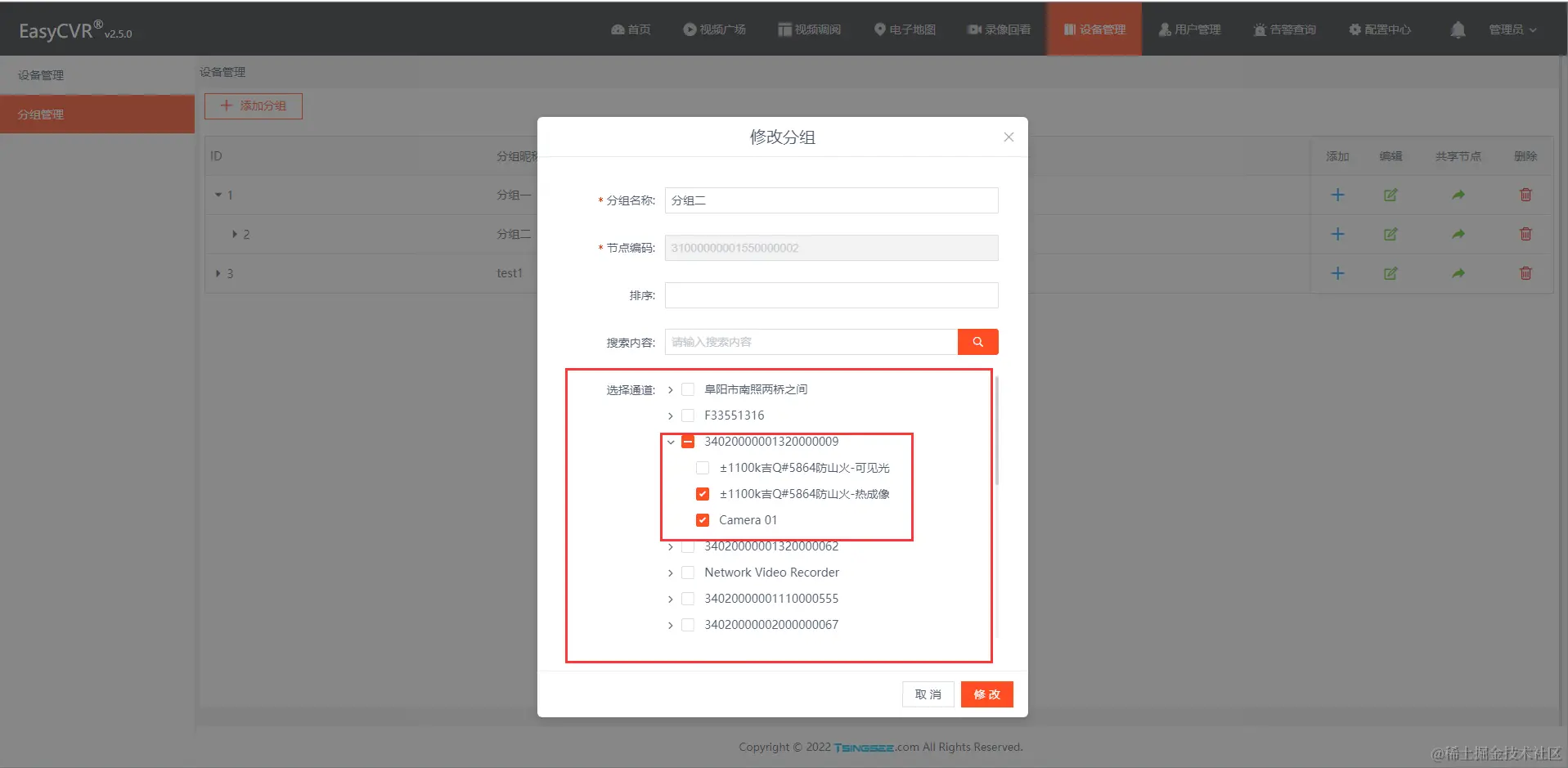 如图所示,在EasyCVR设备管理的设备分组中,新增或修改分组里的选择通道时,在当前设备全选时,取消该设备下的第一个通道,点击修改后页面显示成功,但实际上数据并未修改成功。