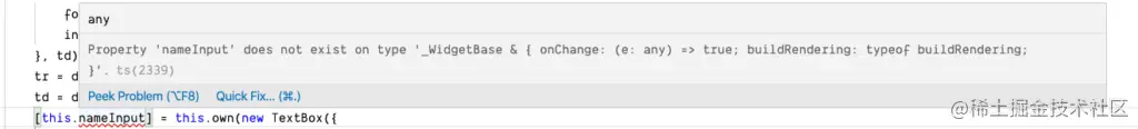 因为TypeScript知道我们的widget扩展自_WidgetBase ,它知道哪些属性是可用的,哪些是不可用的。如果我们试图使用一个不属于_WidgetBase 或我们扩展的属性,我们会看到一个关于该属性不存在的错误--就像我们在nameInput 。为了解决这个问题,我们只需要定义nameInput 属性并告诉TypeScript(通过JsDoc)它是什么类型。把这个添加到buildRendering 属性上面: