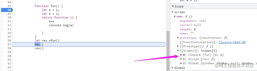 当我们继续执行res(),此时a的值变为了2,继续执行res(),a的值变为了3。也进一步证明,在函数的外部 我们也访问到了函数fun的局部变量。这就是因为闭包导致的。