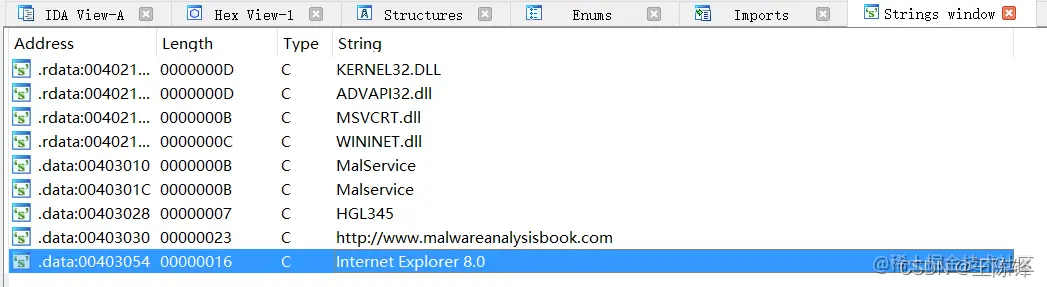 使用IDA进行分析upLad01-02.exe,Strings窗口中可以发现这个恶意代码的网络迹象。