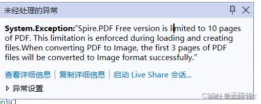 然后去调试,发现是FreeSpire.PDF的问题,它限制了PDF页数不能超过10页。