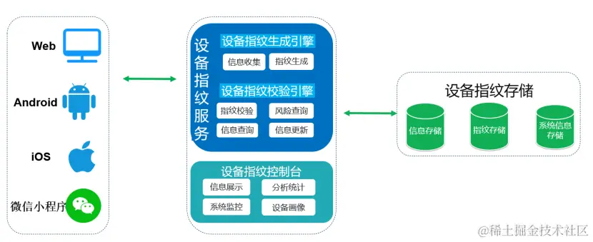 设备指纹系统分为设备指纹前端采集、设备指纹服务、设备指纹控制台三大功能模块,并有配套的数据存储模块。