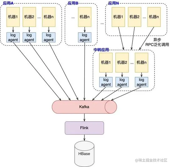 日志收集 :各应用服务通过机器上部署的log_agent收集异步上报的日志数据,并统一传输至Kafka通道中,此外针对少量不支持log_agent的服务,搭建了如图所示的中转应用。