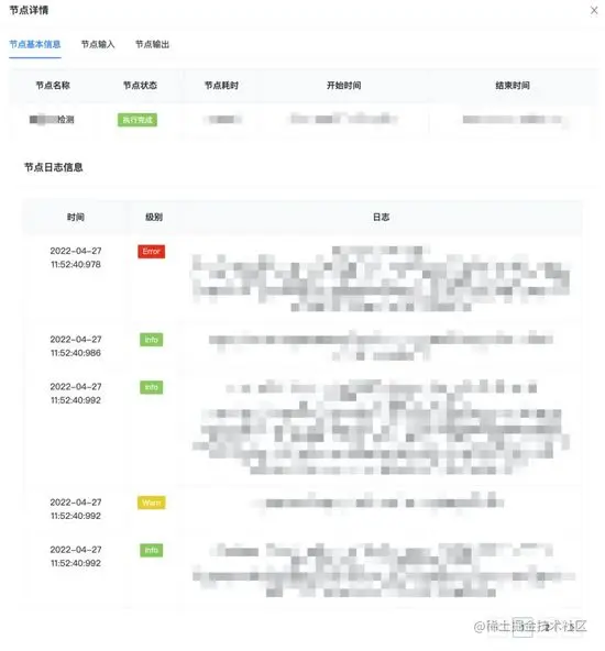 【节点详情查询功能】 :支持展示任意已执行节点的详情,包括节点输入、输出,以及节点执行过程中的关键业务日志。