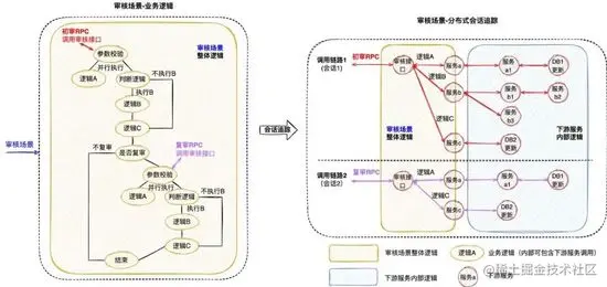 分布式会话跟踪的主要作用是 分析分布式系统的调用行为 ,并不能很好地应用于业务逻辑的追踪。下图3是一个审核业务场景的追踪案例,业务系统对外提供审核能力,待审对象的审核需要经过“初审”和“复审”两个环节( 两个环节关联相同的taskId ),因此整个审核环节的执行调用了两次审核接口。如图左侧所示,完整的审核场景涉及众多“业务逻辑”的执行,而分布式会话跟踪只是根据两次RPC调用生成了右侧的两条调用链路,并没有办法准确地描述审核场景业务逻辑的执行,问题主要体现在以下几个方面: