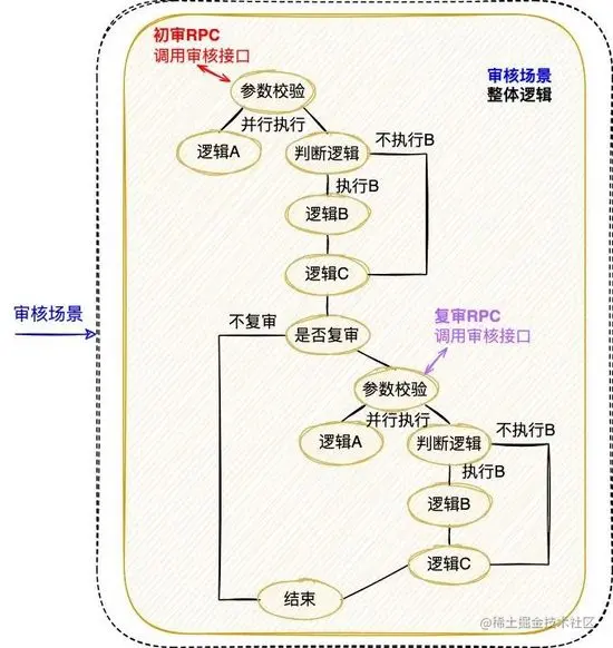 新方案对业务逻辑进行了抽象,定义出业务逻辑链路,下面还是以“审核业务场景”为例,来说明业务逻辑链路的抽象过程: