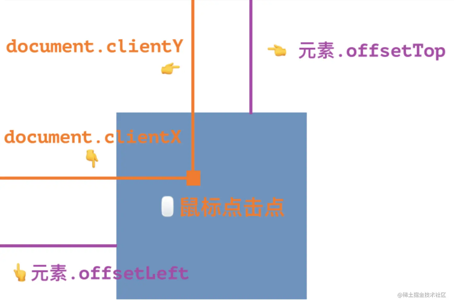 - 盒子左侧距离 = 鼠标点击位置的左侧距离(event.clientX) - 盒子左侧偏移量(offsetLeft)