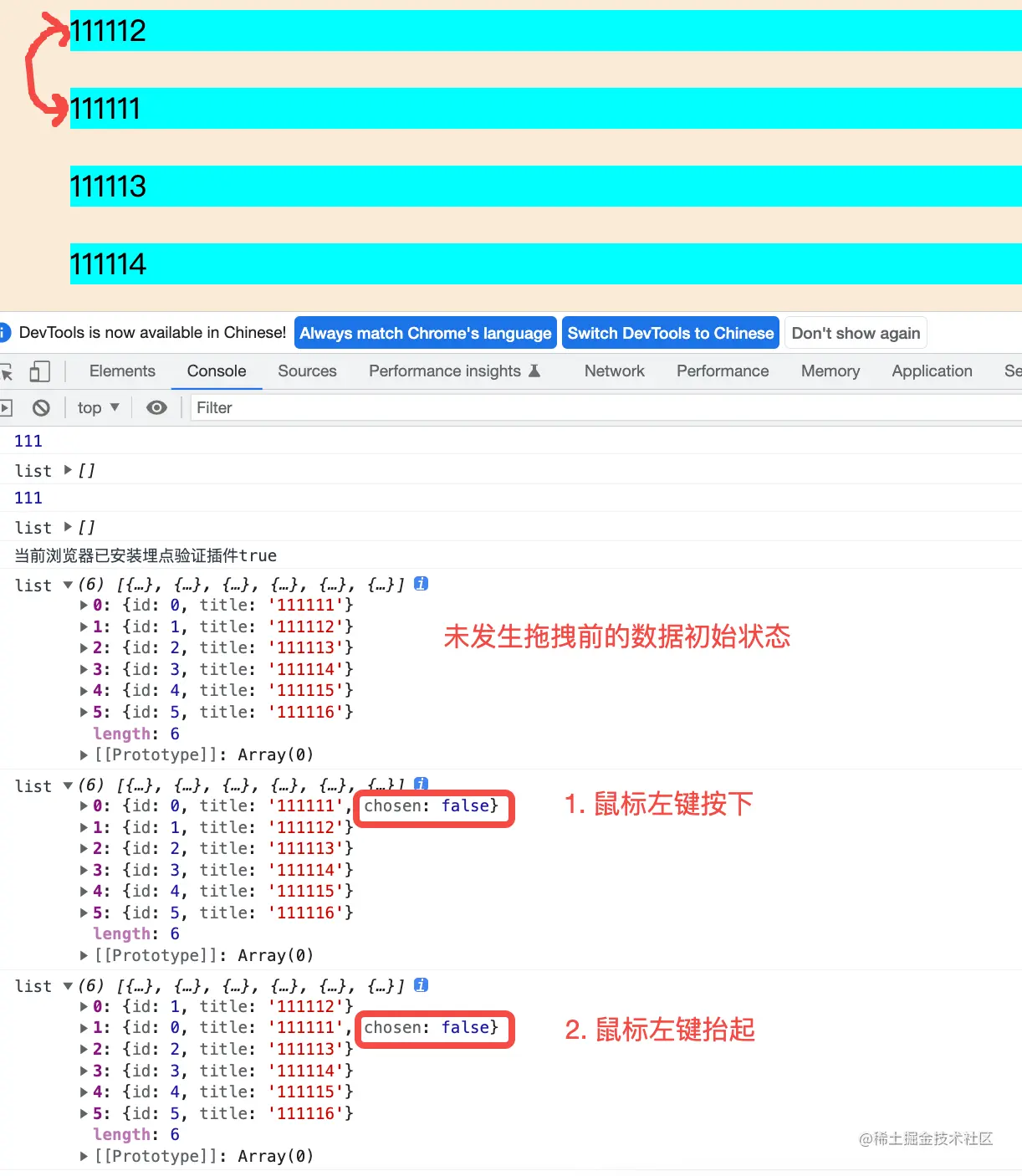 被拖拽的对象会被添加额外属性:在拖拽过程中,被拖拽的对象会被新增chosen: false的属性