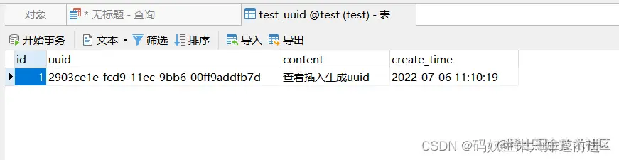 INSERT INTO `test`.`test_uuid`( `content`, `create_time`) VALUES ( '查看插入生成uuid', now());