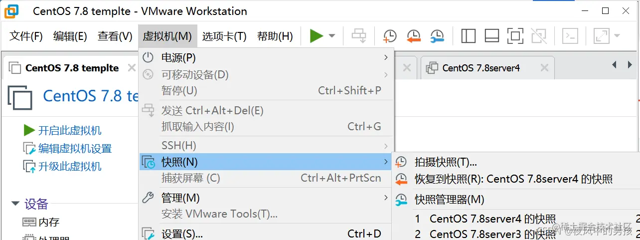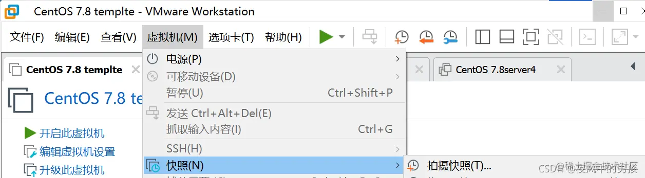 VMware中快照如何使用 夜风中的男孩 2022-07-22 211 阅读1分钟 自说 所谓快照,简单点来讲就如同相机中的一张照片,这张照片只要存在就可以回到拍照之前的状态场景。系统快照就是把系统中的当前状态记录在一个文件中,这个文件通常在你保存虚拟机的工作空间中。当我们在使用系统是误删或者出现故障时,恢复快照,则会返回到你最先拍快照的状态。 快照与备份的区别 快照是数据存数某一时刻的状态 备份是数据存数某一时刻的副本 使用 拍快照 打开虚拟机 菜单栏中选择---虚拟机选项---快照 编辑 恢复快照同样也是在当前选项下选择恢复快照 编辑