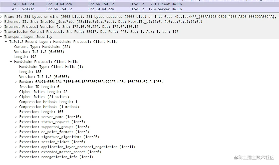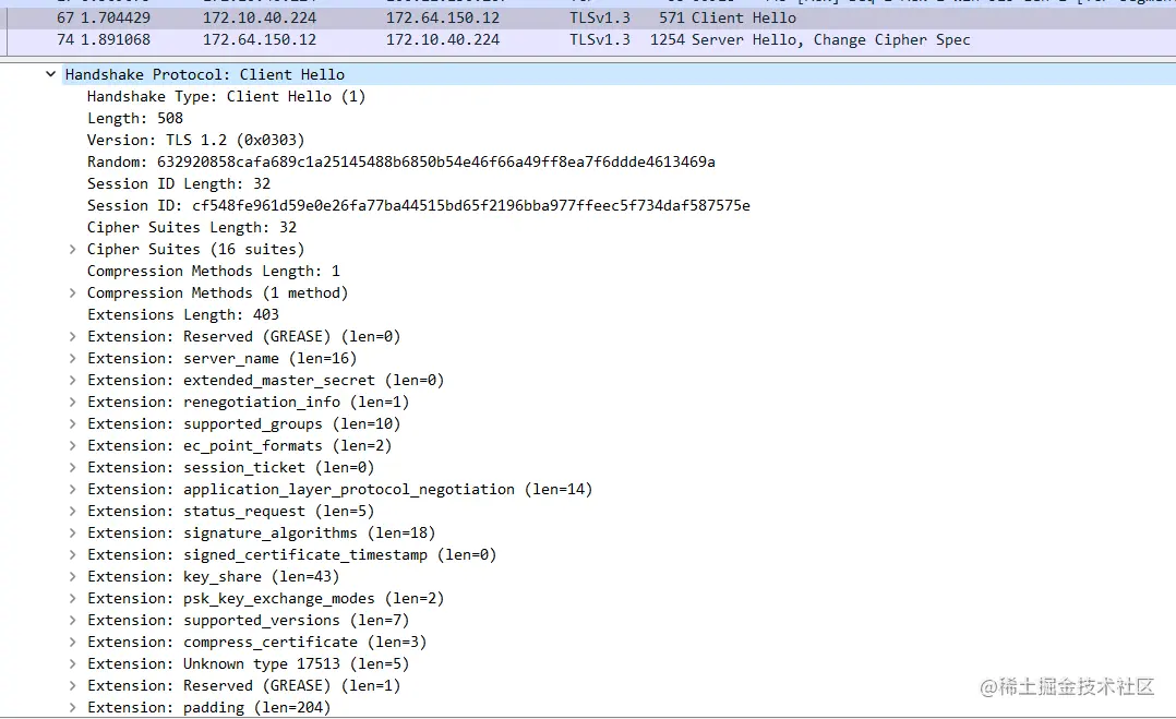 服务端校验客户端没有什么黑魔法,因为都是通过 TCP 协议通讯,不可能存在浏览器发送一个 HTTP 报文和我发送一个同样的 HTTP 报文服务器能识别出来,既然不是校验的 HTTP 层,那只可能是在 TLS 层校验的,于是祭出wireshark抓包,看看能不能找到 TLS 握手中差异化的东西,众所周知在 TLS 握手时有一个客户端发送给服务端的Client Hello报文,很有可能就是根据它来辨别浏览器和非浏览器请求的,因为在这个报文中,客户端要告诉服务端支持的加密套件,TLS 版本等等信息,而这些信息根据客户端的实现都会有所差异,先抓个正常浏览器请求的报文看看,如下图: