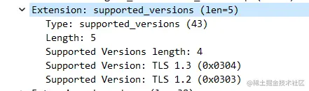 可以看到两边的报文确实存在很大的差异,逐一对比排查之后发现很有可能是因为 curl 的请求报文里缺少supported_versions扩展信息导致的 403,浏览器那边在此扩展信息内容如图: