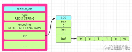 因此当你在Redsi中存储一个字符串Hello时,根据Redis的源代码的描述可以画出SDS的形式的redisObject结构图如下图所示: