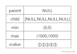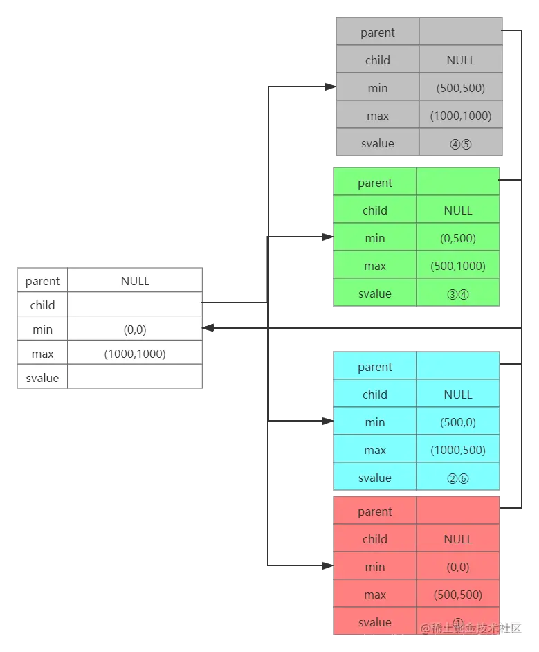 四叉树的每一个结点都对应一个碰撞检测区域,碰撞检测的根区域作为四叉树的根结点。当物体超出结点容量时,则将结点分裂成四个子结点,也即将该结点代表的区域划分为四等分,然后将这些涉及到的物体重新插入到这四个子结点。