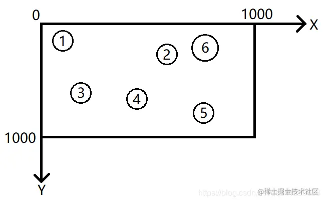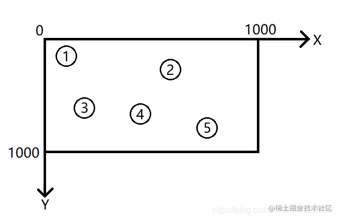 ①假设四叉树结点容量为5,现在区域内有以下物体:
