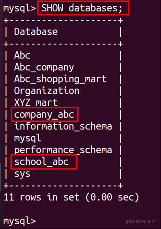我们将尝试创建名为 "company_abc "的数据库和名为 "school_abc "的模式,我们将创建表并尝试在两个表中插入数据并观察结果,但在创建表之前,我们将创建一个数据库为