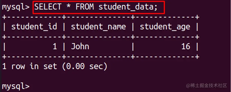 INSERT INTO student_data VALUE (1, “John”, 16);