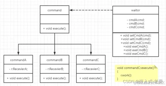 命令模式的本质,是把接收命令的人、执行命令的人做了一个解耦。这样,不同的命令就成了一个个独立的个体。一个比较贴切的案例就是餐馆。餐馆里面的服务员会接收各种各样的服务要求,比如来一盘炒菜、来一个汤、来一份主食。这些点菜服务都可以看成是命令。把这些命令独立出来,并且把命令匹配给对应的执行者,这就是命令模式设计的初衷了。如果要画成类图,应该是这样的,