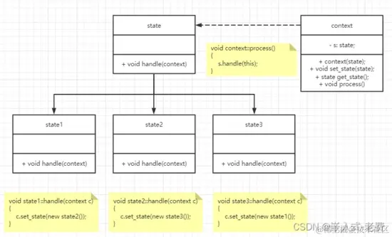 状态模式其实和状态机是一个道理。不管是软件设计,还是fpga硬件设计,状态机都是使用比较多的一种方式。状态机很容易就构建一个封闭、鲁棒的系统。而设计模式,只是告诉我们如何用面向对象的语言来构建状态模式,