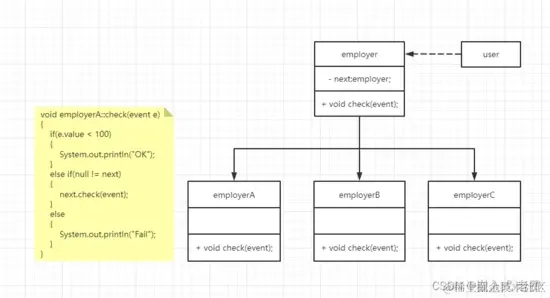 责任链模式是很容易和现实场景联系在一起的设计模式。比如说出差需要报销发票,这个时候不同的领导额度是不一样的,比如低于300科长可以报销,低于1000部长可以报销,低于5000可能就要总经理报销了。责任链也就是这个道理,