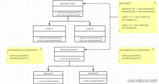 上图中的element就是各种物体,visitor就是各种画画艺术。每种物体想通过具体的艺术形式呈现出来,这就需要visitor来帮忙了。element和visitor是通过入参来完成关联的,这是一种轻量耦合的方式。