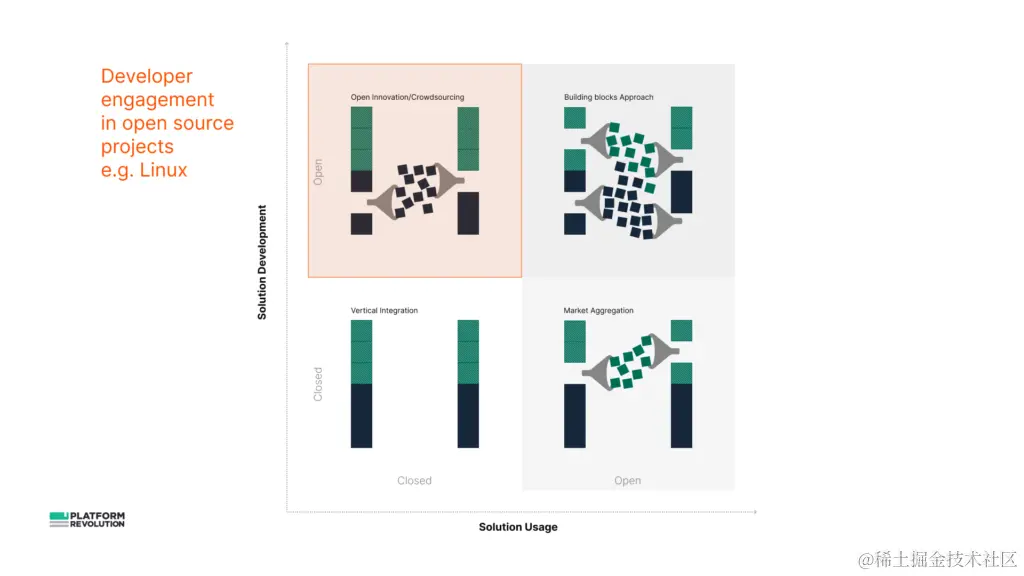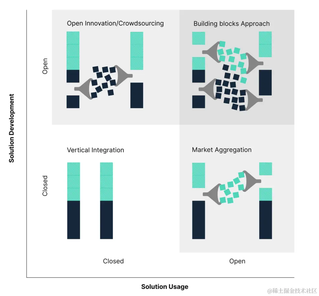 开源项目主要依赖开发人员生态系统进行解决方案开发。然后通过传统的公司所有的渠道(例如 Redhat 与 Linux 的关系)对软件进行打包、交付和支持。这在左上象限中显示。