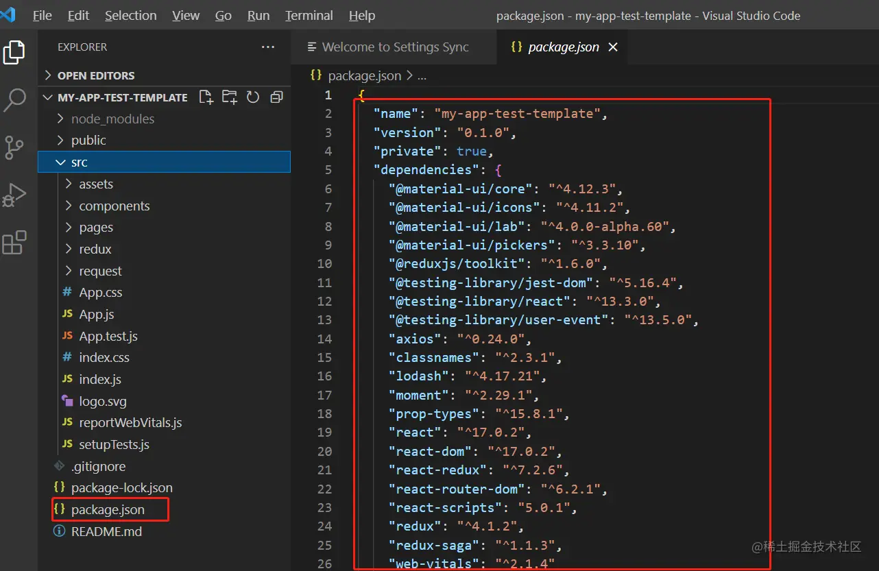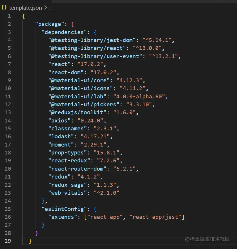 下面的template.json就是你补充的信息,这里你可以添加自己的dependencied字段信息,script等,当然template.json的字段也是固定的,详情可以去官网查看,以下是我这边需要添加的lib,react相关的基础依赖例如react和react-dom以及unit test相关的lib在CRA初始模版里面已经存在了,如果对版本没有要求可以不需要再进行add,我这边是需要特定的17.0.2版本: