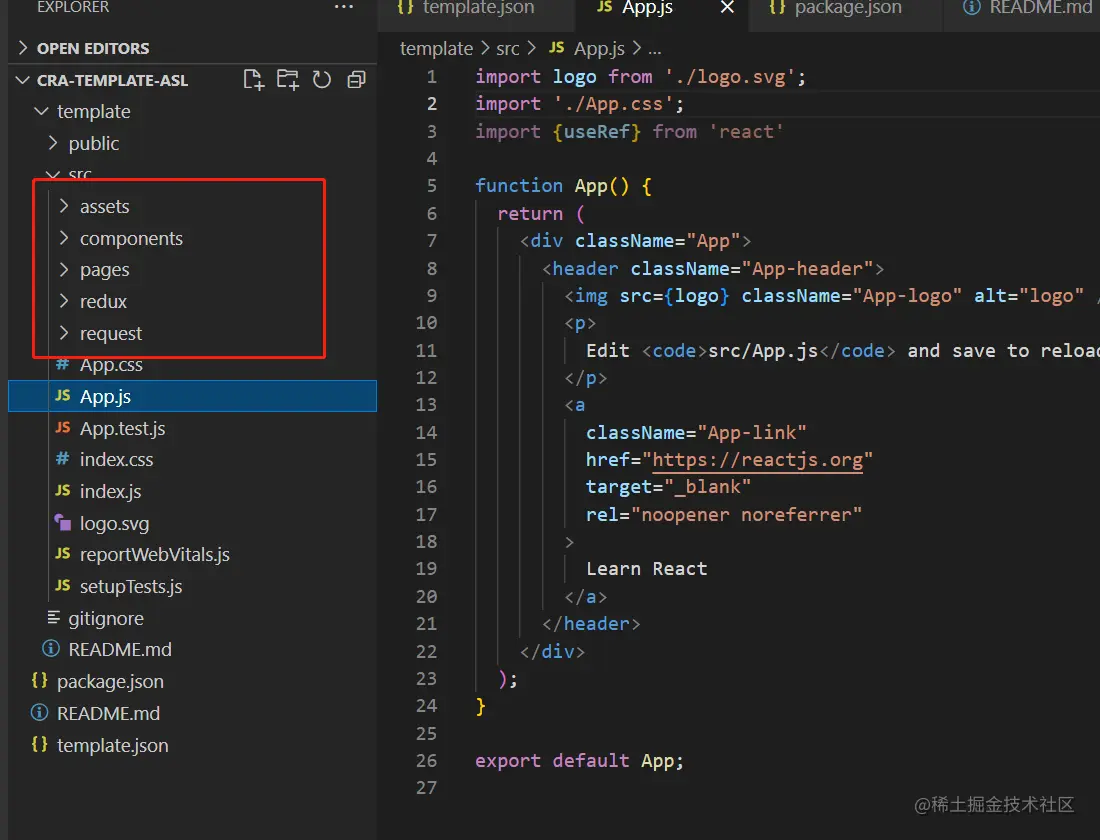 第二步:按照CRA的template需要包含的信息构建项目内容,重要的是对package.json和template.json的补充,可以参考我上面的配置,自定义的内容则是按照自己的需要添加