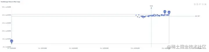 为了能够更加直观的展示出实际资源的利用率,EasyEagle将集群每台节点的资源利用率以散点图的形式进行展现,如下图例所示。每个点代表集群中的一个计算节点,横坐标和纵坐标分别是节点内存和CPU利用率。在理想的情况下,机器的内存使用率和cpu使用率应该较为平衡,体现在图中将会是所有点均匀分布在斜率为1的一条线附近。而在所示图例中,发现大多数机器节点cpu利用率明显偏高在40%左右;而内存利用率却不足15%。那么就需要关注,集群中每台计算节点配置和虚拟核及内存大小比例是否合理。