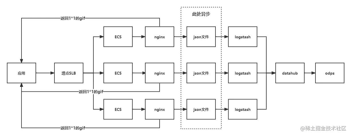 上图的流程是这样的,应用推送规定的参数到埋点服务器,nginx接收埋点信息,将其转换成json文件保存到服务器上,然后logstash读取json文件,经过过滤将其推送到datahub,最后odps定时去datahub中拉取埋点数据。