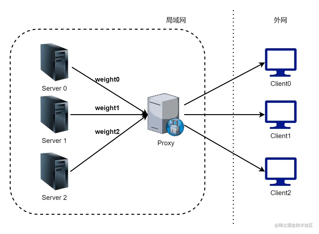 拿 加权轮询 来说,这个时候可以引入一个 weight 的概念,对于计算能力富余一些的 Server 服务器可以把负载权重赋大一些,把计算能力捉襟一些的 Server 服务器的负载权重稍微调小一些,这样的架构差不多可以这么表现:
