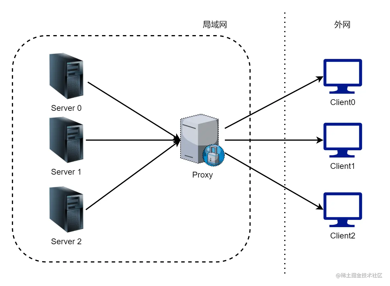 这个时候的 代理 (Proxy) 还是个 反向代理中间商,只不过这个 中间商 不只是简单的 请求 / 连接 Server 服务器,还可以 均衡 Server 服务器的计算承载 。