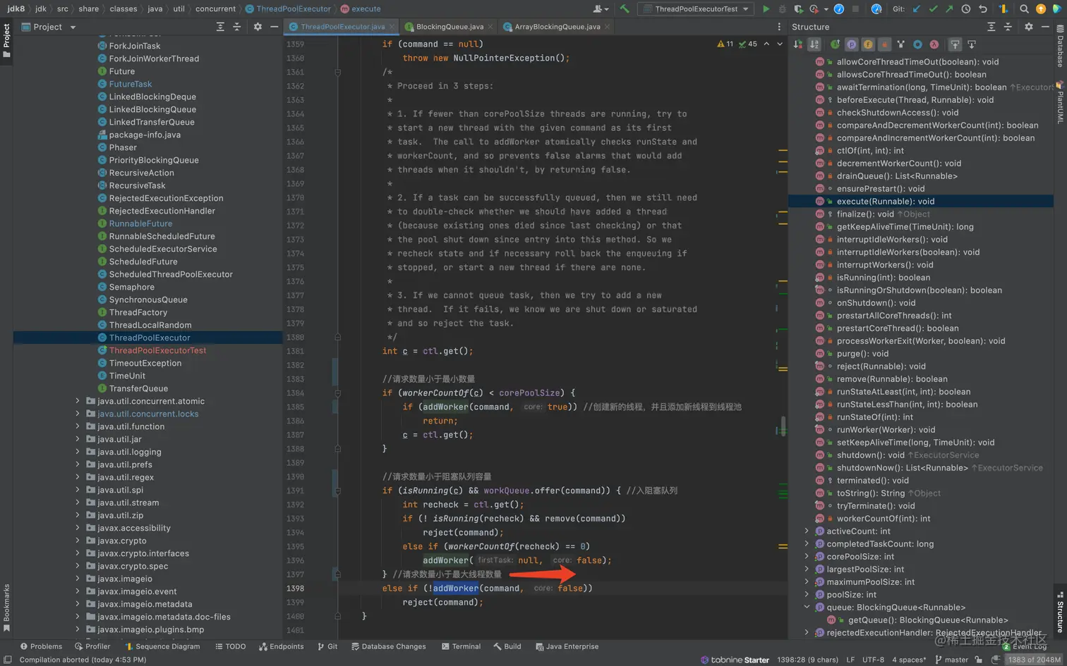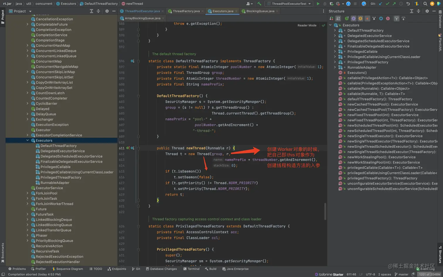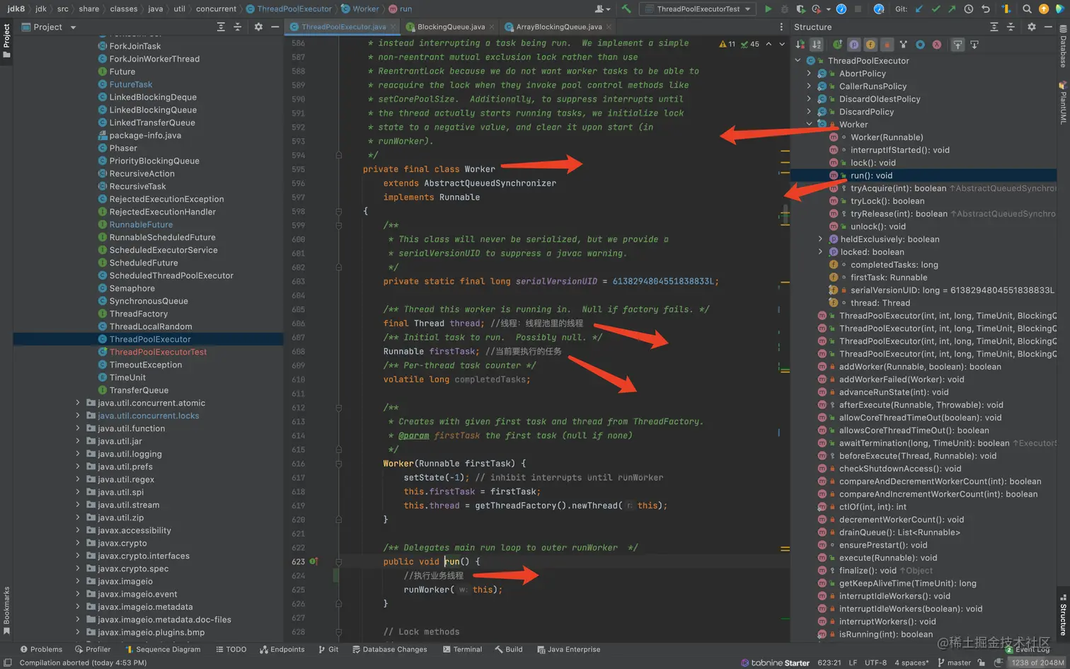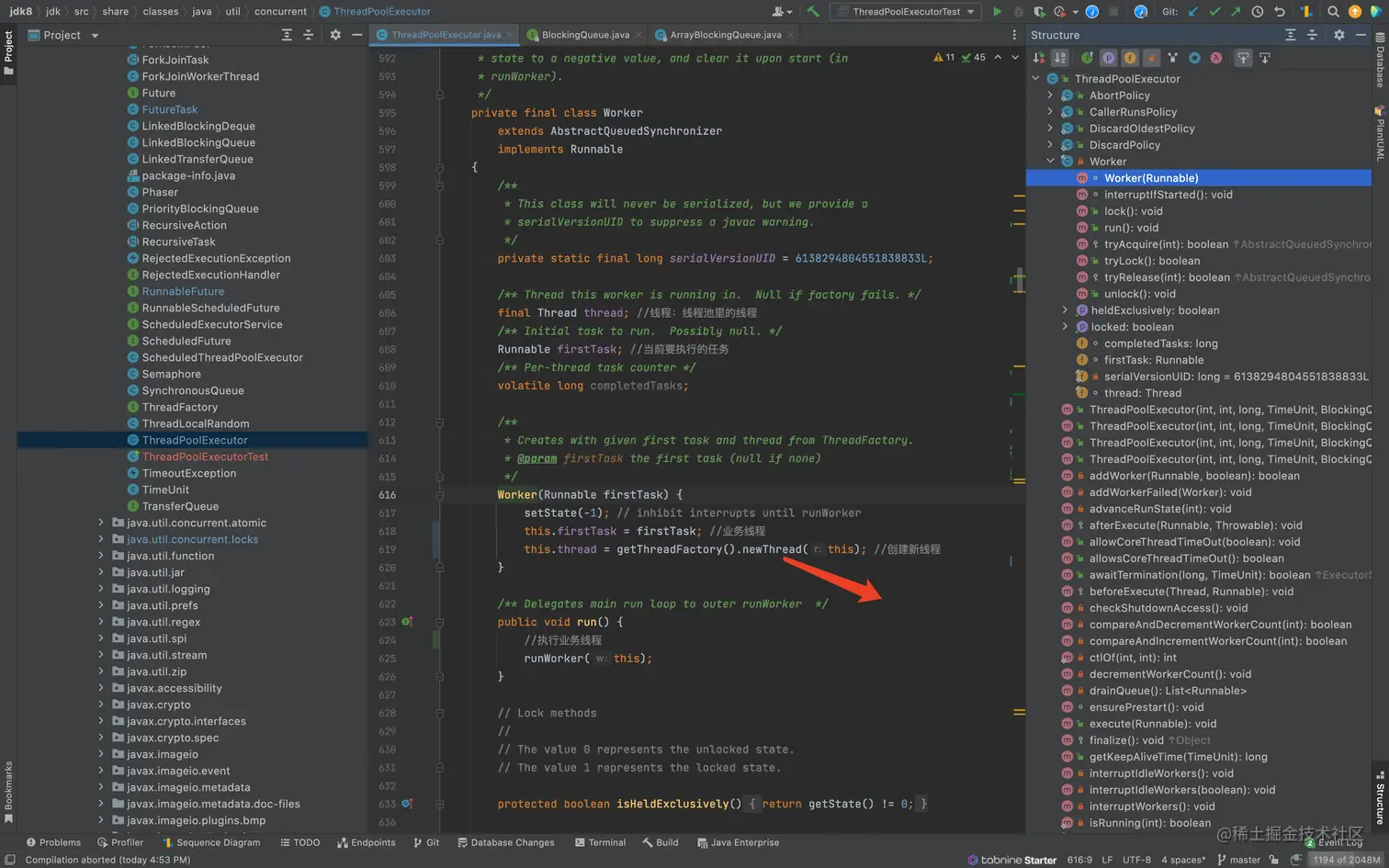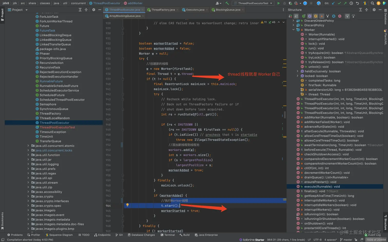 注意,线程池里的线程是工作线程,其实本质就是Worker:Worker的作用就是,不断从阻塞队列消费数据。