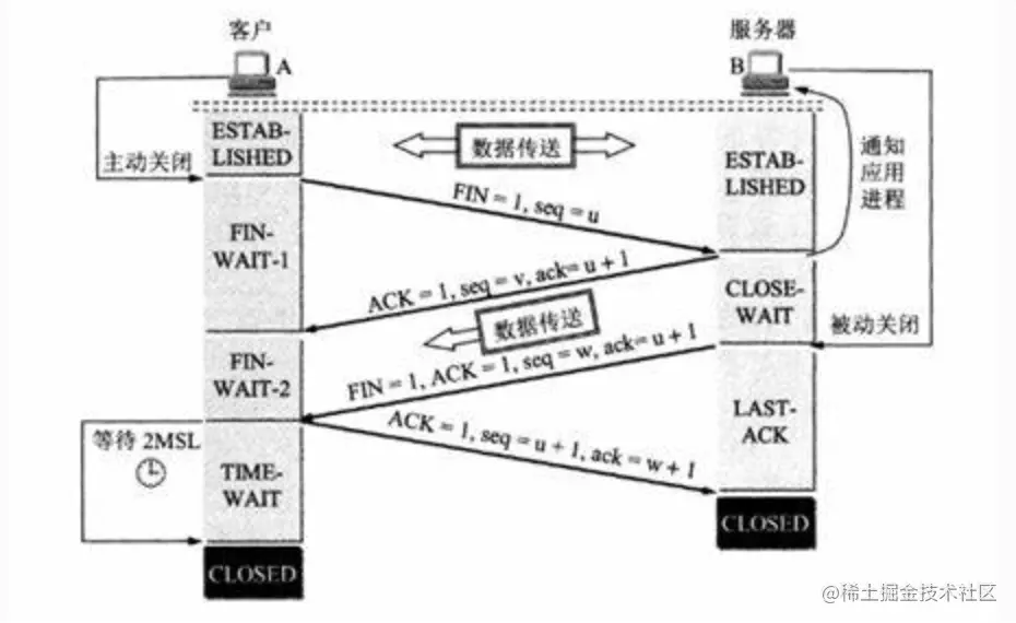主动关闭方(A)先向对方发送FIN消息,因为TCP是有序的,所以FIN将晚于在此之前A发给B的所有数据报文,B收到FIN以后将会回复一个ACK,并通知应用进程此连接需要关闭,这时B的系统缓冲区内可能还有数据在继续向A发送。应用进程收到关闭通知后触发被动关闭流程,这时B也会向A发送一个FIN消息,然后等待A的ACK,收到ACK后即可关闭连接。A则进入TIME-WAIT状态,A这时候还不能关闭而是需要等2MSL是因为B可能没收到它的最后一个ACK从而一直等待从而导致资源无法释放。