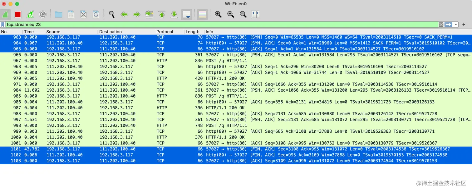 下图是用WireShark抓的一组HTTP请求的包,HTTP是基于TCP的,所以可以看到最开始会有TCP的三次握手: