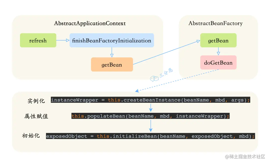 AbstractBeanFactory#doGetBean方法,在这个方法里可以看到Bean的实例化,赋值、初始化的过程,至于最终的销毁,可以看看ConfigurableApplicationContext#close()。编辑