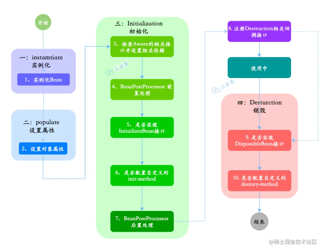 销毁:第 8~10步,第8步其实也可以算到销毁阶段,但不是真正意义上的销毁,而是先在使用前注册了销毁的相关调用接口,为了后面第9、10步真正销毁 Bean 时再执行相应的方法