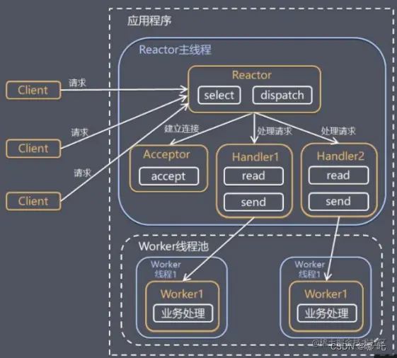 4.handler 只负责响应事件,不做具体的业务处理, 通过read 读取数据后,会分发给后面的worker线 程池的某个线程处理业务。