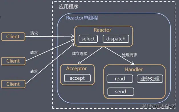 Reactor 在一个单独的线程中运行,负责监听和分发事件,分发给适当的处 理程序来对 IO 事件做出反应。 它就像公司的电话接线员,它接听来自客户的电话并 将线路转移到适当的联系人;