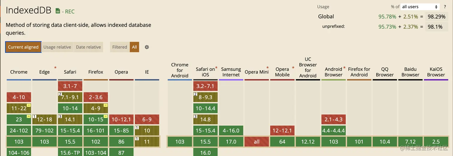 随着浏览器功能的不断增强,为了解决浏览器可以存储、操作大量数据的场景,出现了 indexedDB,它可以理解为浏览器本地的数据库,通过 JavaScript 脚本操作,并且提供索引和查询 API,需要注意的是,它并不属于关系型数据库。