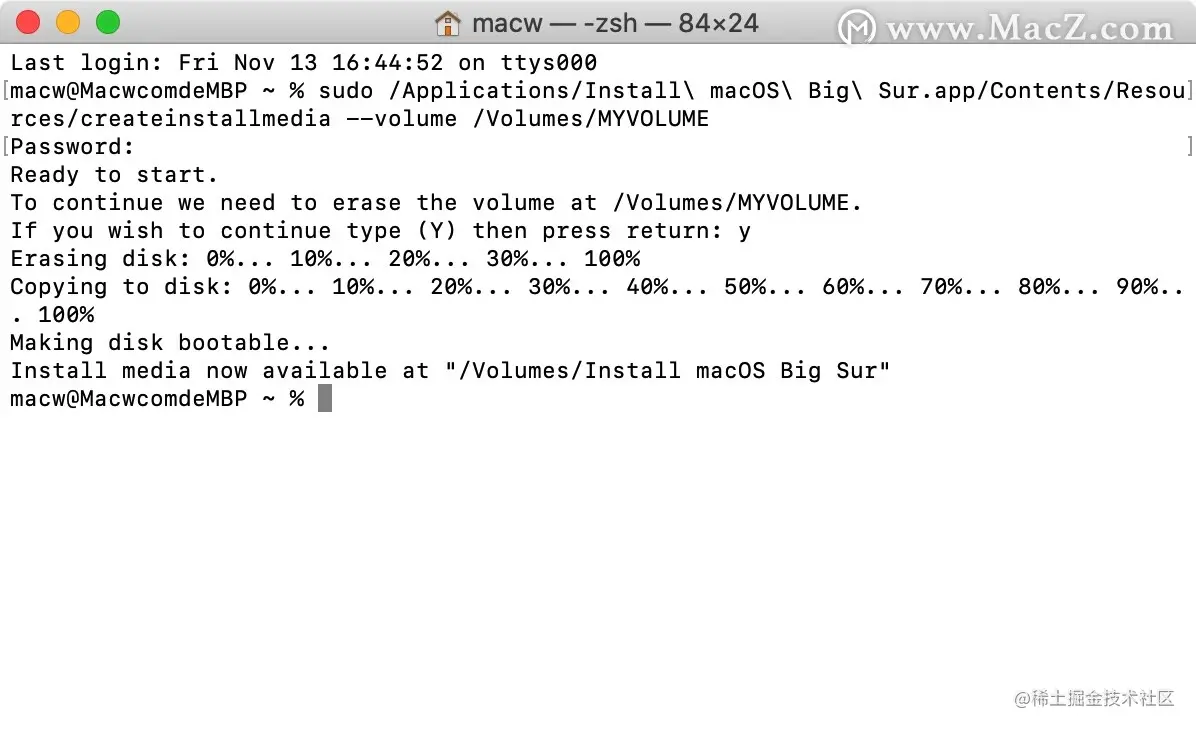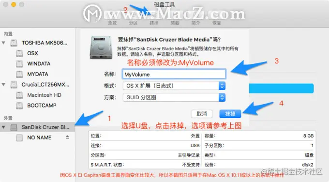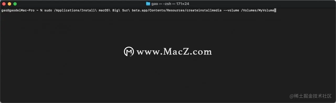 插入u盘,将U盘在「磁盘工具」中初始化,并在「终端」输入一下命令,其中「MyVolume」代表自己的U盘名称,重要的事再说一遍 MyVolume 是你U盘的名字,格式化之后U盘的名字