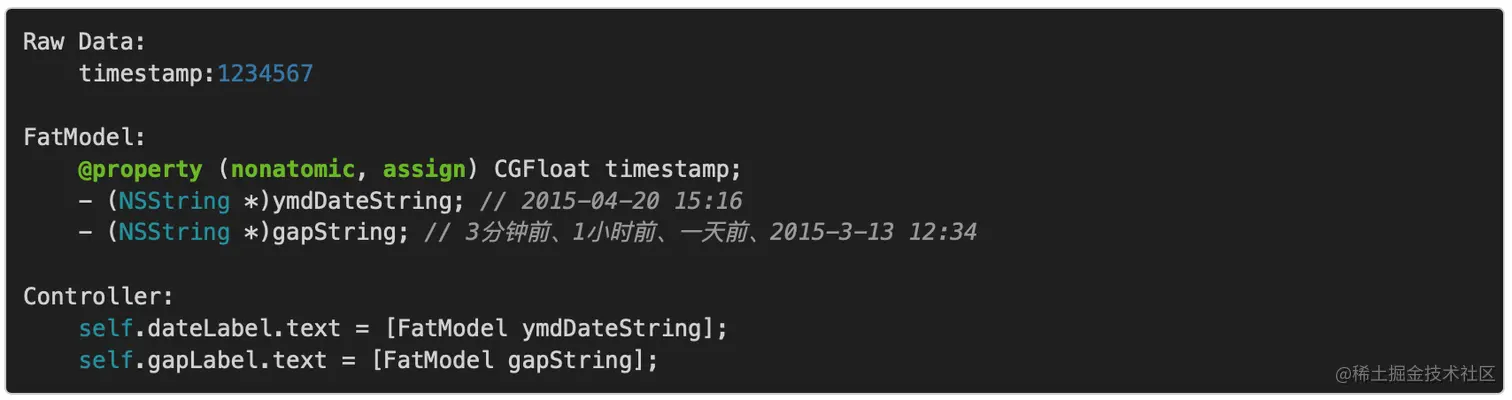 把timestamp转换成具体业务上所需要的字符串,这属于业务代码,算是弱业务。FatModel做了这些弱业务之后,Controller就能变得非常skinny,Controller只需要关注强业务代码就行了。众所周知,强业务变动的可能性要比弱业务大得多,弱业务相对稳定,所以弱业务塞进Model里面是没问题的。另一方面,弱业务重复出现的频率要大于强业务,对复用性的要求更高,如果这部分业务写在Controller,类似的代码会洒得到处都是,一旦弱业务有修改(弱业务修改频率低不代表就没有修改),这个事情就是一个灾难。如果塞到Model里面去,改一处很多地方就能跟着改,就能避免这场灾难。